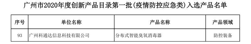 喜讯!分布式智能臭氧消毒器入选广州市2020年度创新产品目录